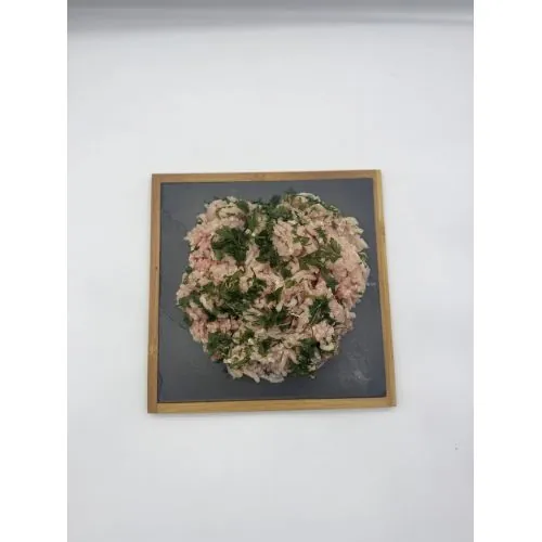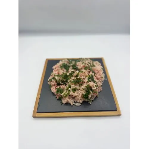 Tierna pechuga de pavo picada con hojas de perejil fresco . Cantidad 500grs.