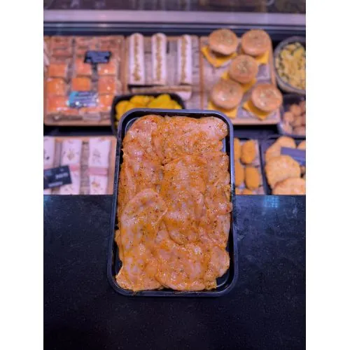 Tierna pechuga de pollo con una salsa de chilli casera. Picante para casi todos los públicos. 250grs por ración.