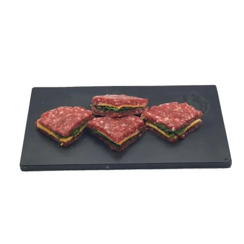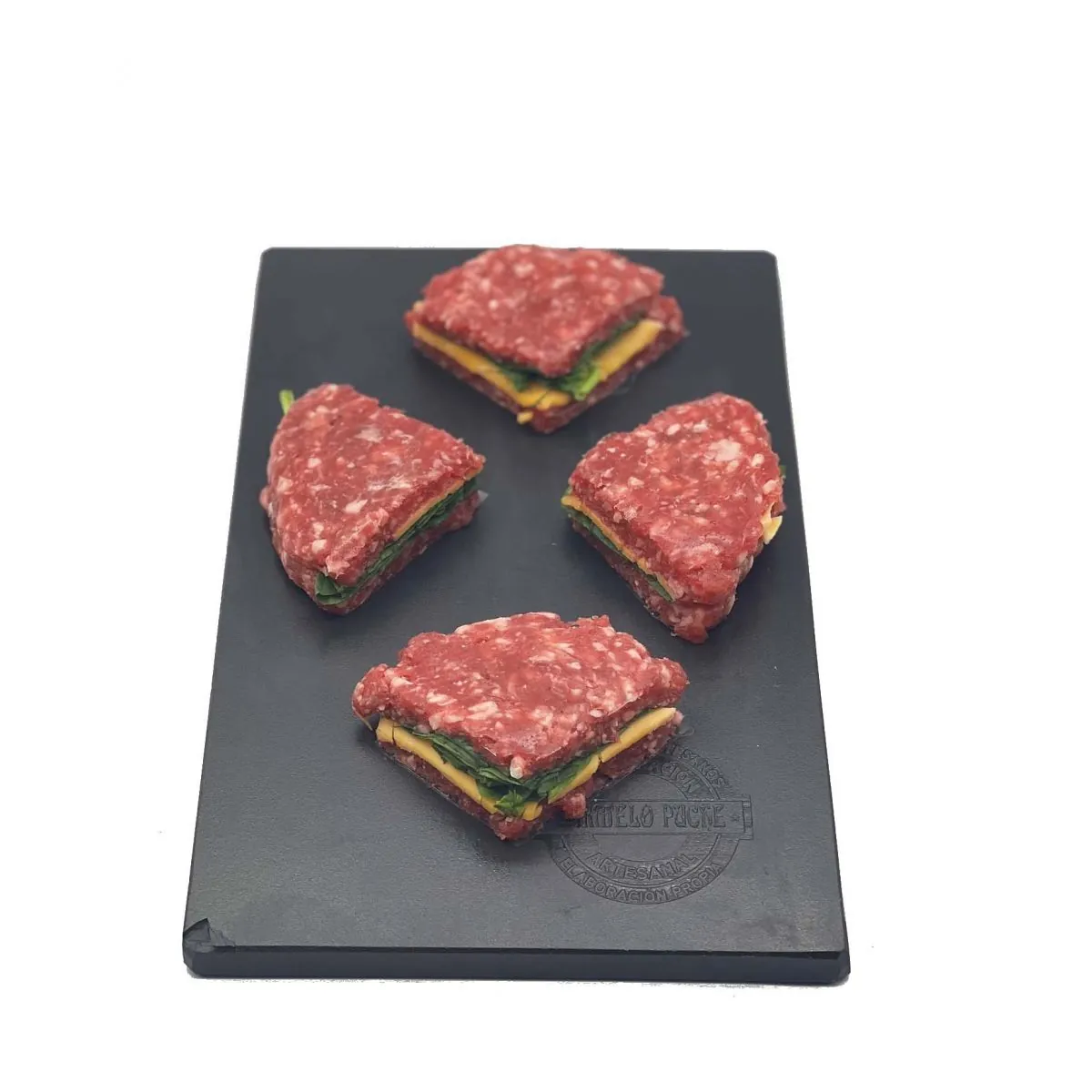 Preparado de carne picada de ternera con relleno de queso cheddar y espinacas, condimentado. Producto elaborado con la misma carne de ternera utilizada en nuestras burger meat, con un relleno interior de queso cheddar y espinacas que aporta cremosidad y un contraste suave de sabor. Ideal para plancha o parrilla.